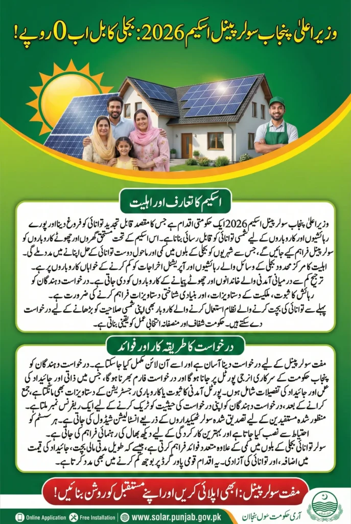 CM Punjab Solar Panel Scheme 2026 is a government initiative aimed at promoting renewable energy and making solar power accessible to residents and businesses across Punjab. This scheme offers free solar panels to eligible homes and small enterprises, helping citizens reduce their electricity bills while adopting eco-friendly energy solutions. With increasing electricity costs, the program provides a practical way to save money and contribute to a greener future.